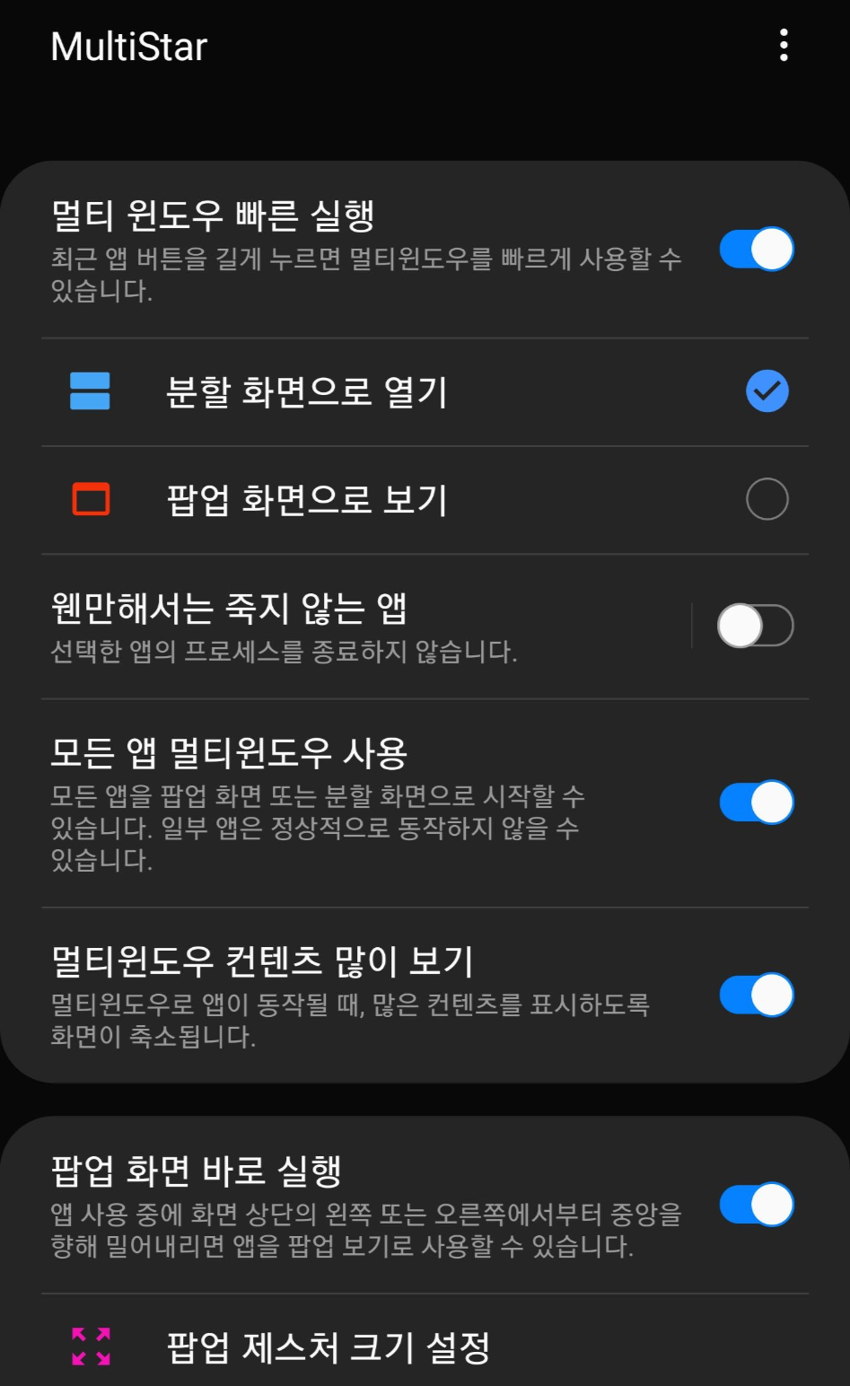 설치후 MultiStar 실행화면에서 아래 화면과 같이 "모든 앱 멀티윈도우 사용"과 "멀티윈도우 컨텐츠 많이 보기" 기능을 활성화해 줍니다. 참고로 "모든 앱 멀티윈도우 사용"을 활성화 하시면 시스템을 재시작합니다.