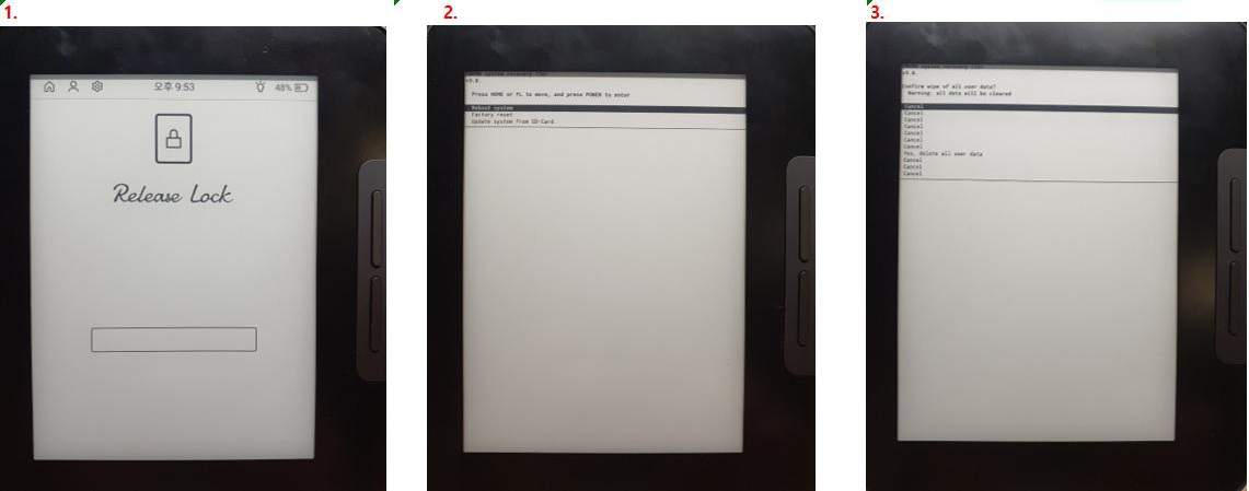 3. 홈버튼으로 factory reset 이동 후 전원버튼으로 선택
