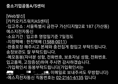 우선 워치폰은 LG 서비스 센터에서 하는게 아니라 별도의 AS접수센터 (중소기업공동 A/S센터)가 있어요. 전화해서 AS 접수를 하면 택배기사가 와서 픽업해 가고 수리 후 다시 보내주는 시스템이죠.
