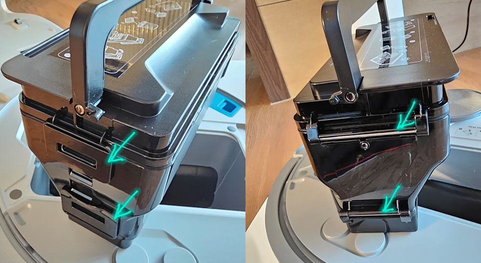 손잡이를 들어올린 상태에서 왼쪽은 사진 왼쪽과 같이 락앤락 뚜껑처럼 체결되어 있습니다.