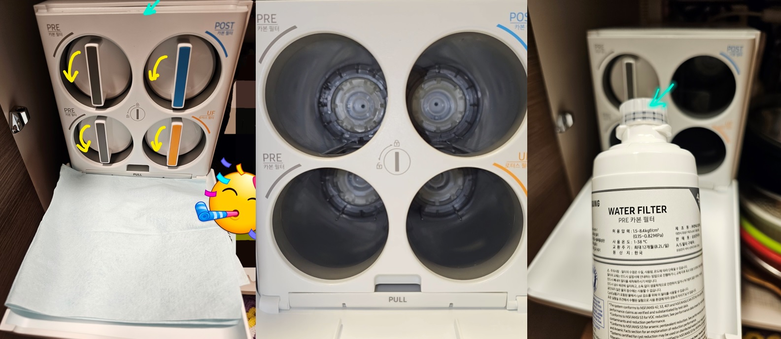 내부 물기를 정리 하시고, 새로운 필터를 장착합니다.